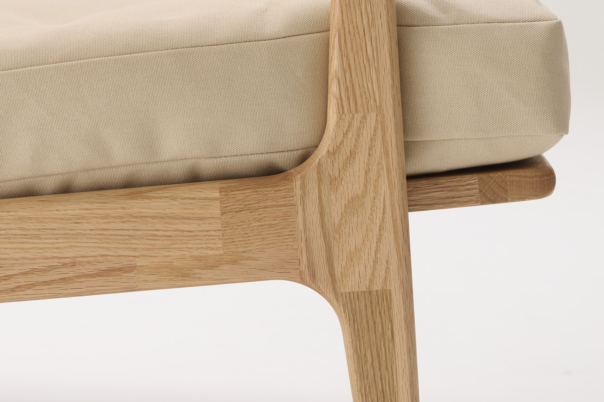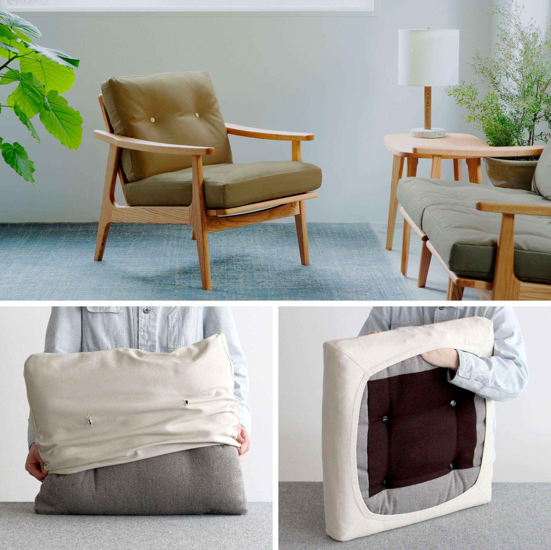 フレームチェアの背座クッションに、日常のお手入れがしやすいよう、クッション全体を包み込む専用カバーをご用意しました。カバーには、しなやかな綿100%の生地使用。身体にやさしくなじみ、ご自宅で洗濯することができます。