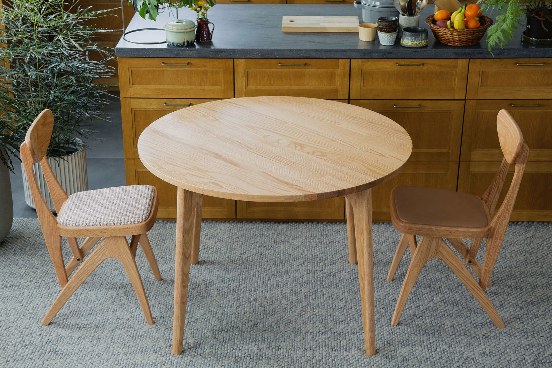 ラウンドテーブルに待望の無垢天板が追加になります。ムク仕様のラウンドテーブルには、生産過程で生まれる端材を再活用しています。貴重な天然資材である木材を無駄にしないため、端材を集成し、継手の技を活かすことで、新たな生命をあたえます。天板には、通し材と縦継ぎ材の両方を用い、軽快さと木質感を感じられる仕上がりにしました。