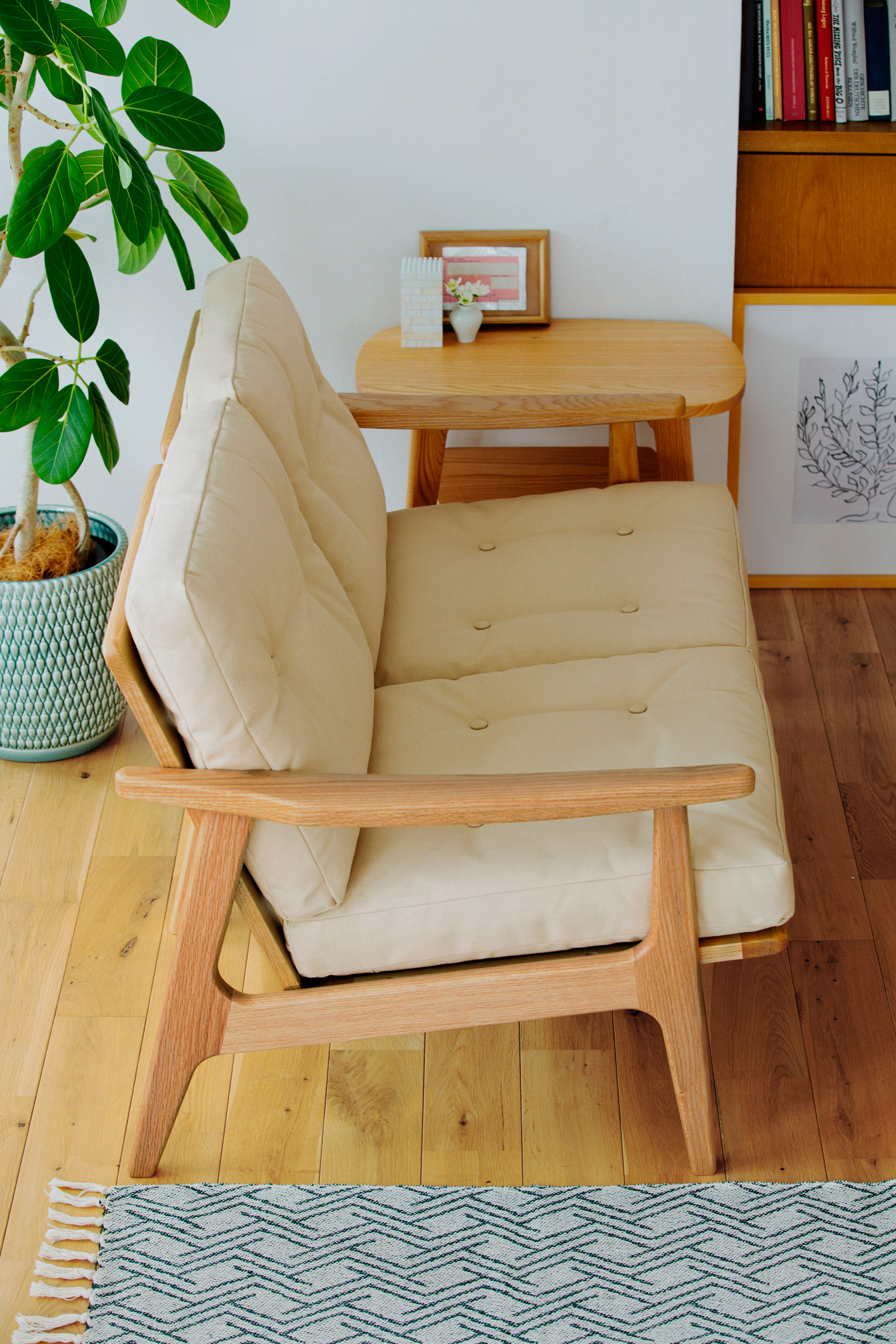 - フレームチェアの背座クッションはフェザーでふんわりとした座り心地。こまめにお手入れすることで、形崩れを防ぎ快適さを長く保てます。